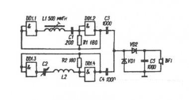 The metal detector, the diagram of which is shown in the figure, is made on one chip. It consists of two identical LC generators and a detector to the output of which the headsets are connected. The generators are high-frequency, operating at a frequency of about 465 kHz. One of the generators has a non-tunable circuit, the circuit of the second has a volumetric coil L2, the inductance of which changes when approaching a metal object.